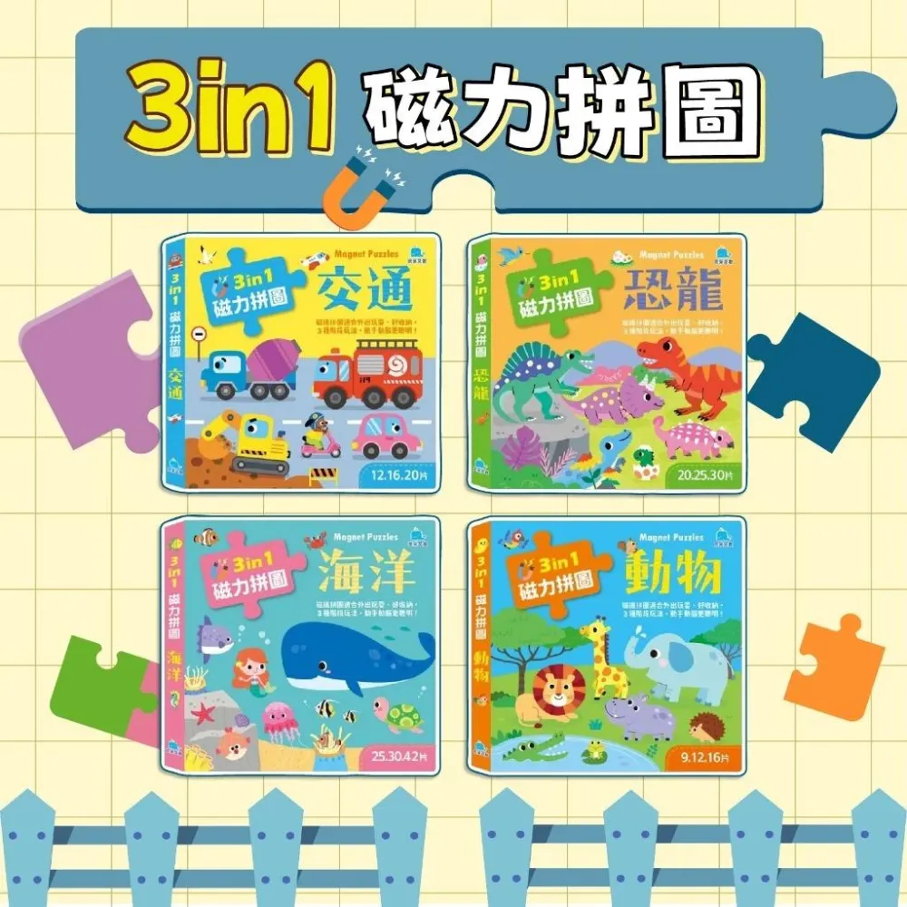 京采文教[幾米兒童圖書] 現貨 3合1磁力拼圖:海洋 / 恐龍 / 交通 / 動物 京采 手眼協調 拼圖 磁鐵拼圖 觀察力 感知