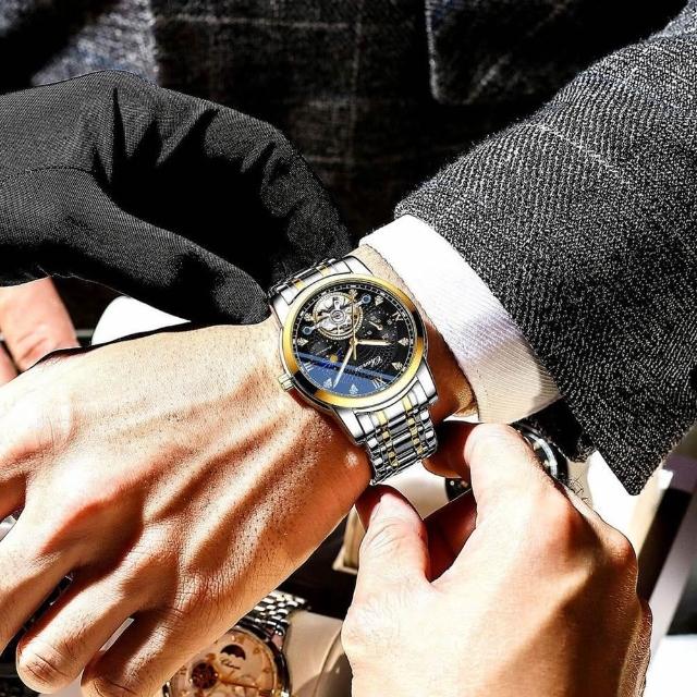 男士手錶 鏤空陀飛輪 日月星辰 防水鋼帶手錶 全自動機械錶 8870