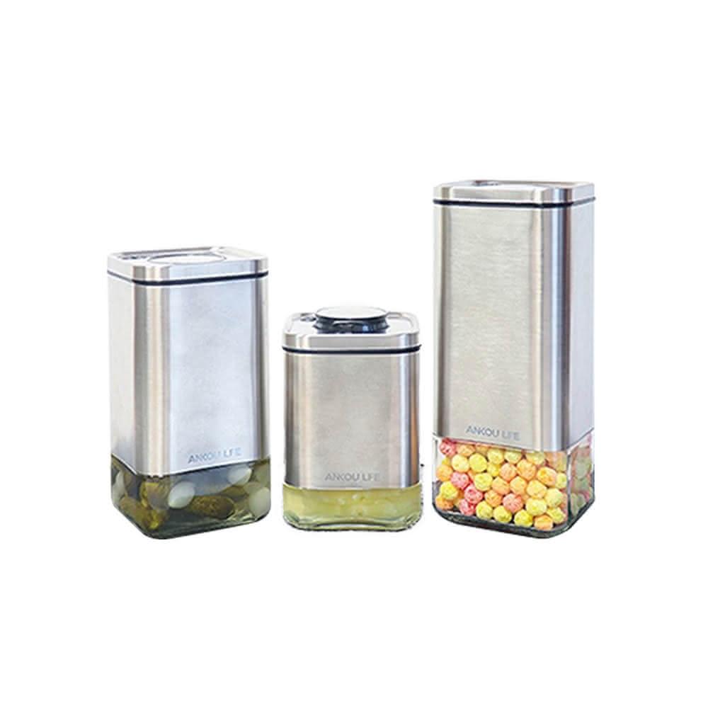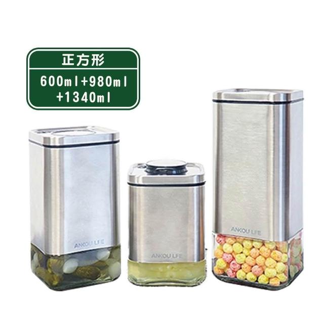 安酷生活三件組方形不鏽鋼玻璃 一鍵按壓全防漏萬用保鮮密封罐(儲物罐 / 收納罐)