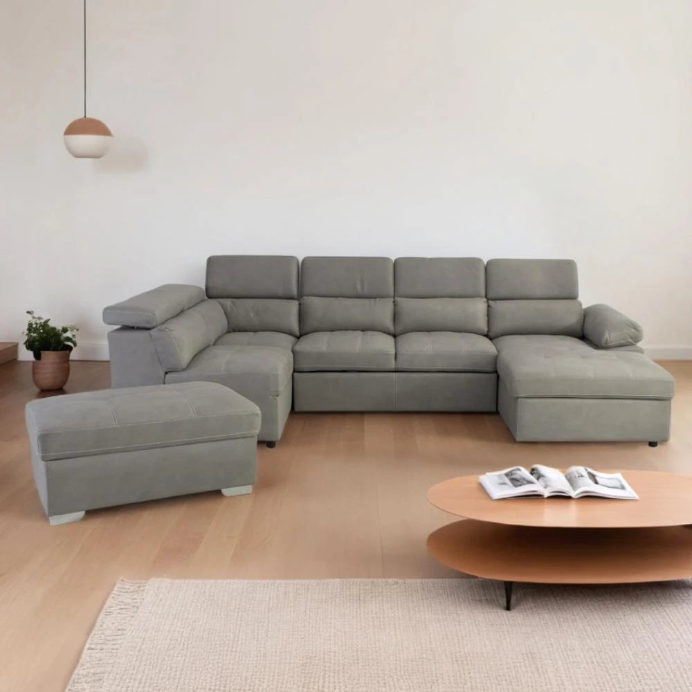 HOME+芙利多功能U型落地手拉貴妃沙發椅/布沙發(沙發床/附收納凳)