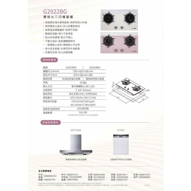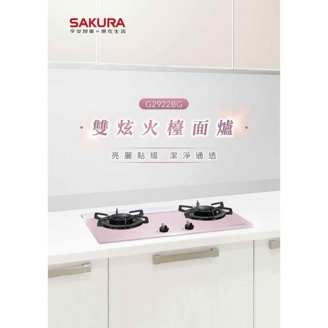 SAKURA櫻花 智能 雙炫火 二口 玻璃檯面爐 G2922BG 胭脂粉 瓦斯爐 雙炫火 (全國安裝) 粉紅色