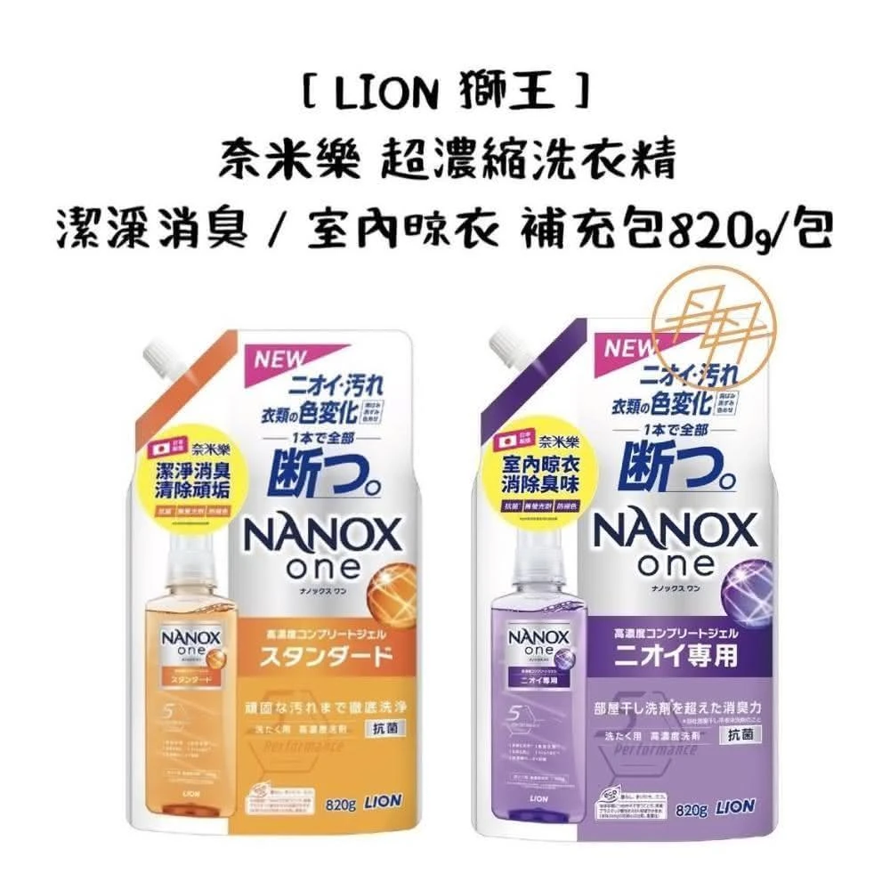 LION 獅王奈米樂 超濃縮洗衣精 補充包820g/包 (潔淨消臭/室內晾衣)