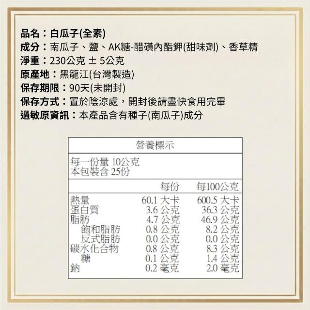 白瓜子230g x3包(全素 年節必備 細火烘炒 南瓜籽 堅果 瓜子 南瓜子 素食 年貨 食品 零食 白瓜籽)