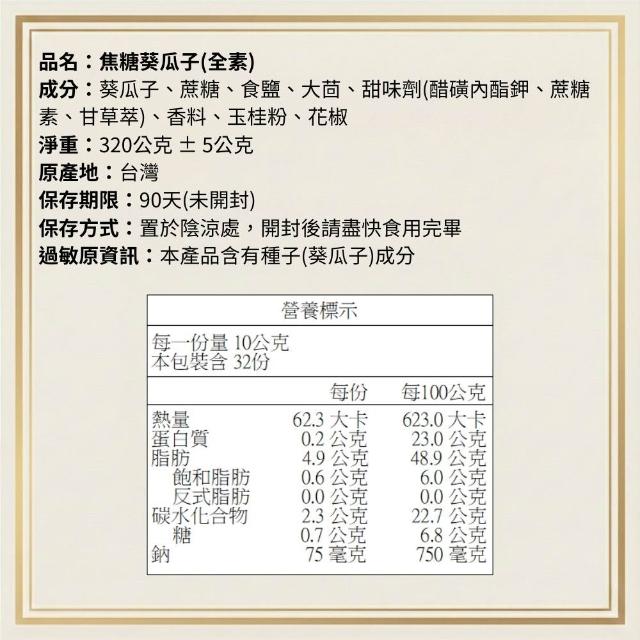 焦糖葵瓜子320g x3包(全素 泡茶下酒必備 純天然食材 無防腐劑 瓜子 葵瓜子 焦糖瓜子 葵花籽)