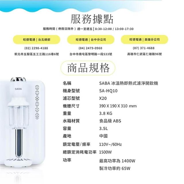 SABA3.5L冰溫熱即熱式濾淨開飲機(SA-HQ10)飲水機/泡茶機/泡奶