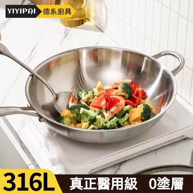 易億派_32-36cm不鏽鋼炒鍋 316不鏽鋼炒菜鍋 無油煙不沾炒鍋 家用無塗層不粘鍋 帶玻璃蓋木鏟 燃氣灶電磁爐通用
