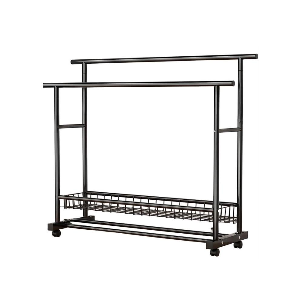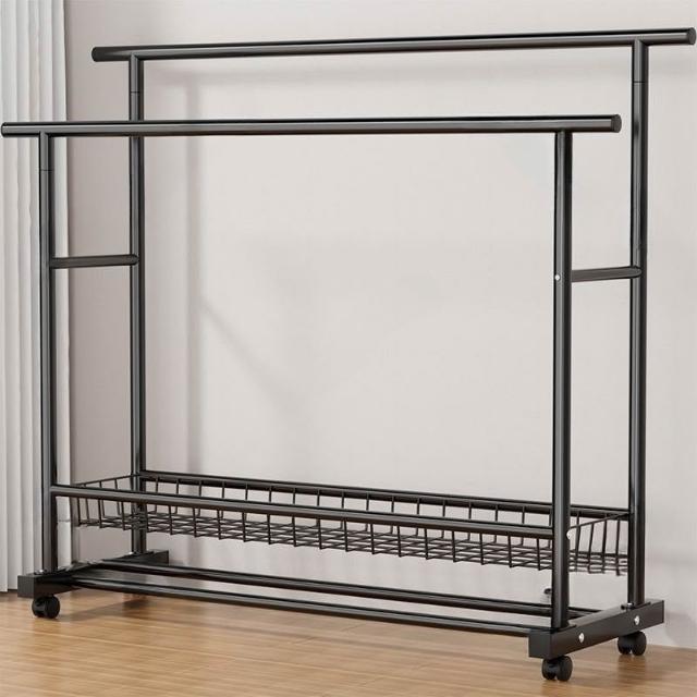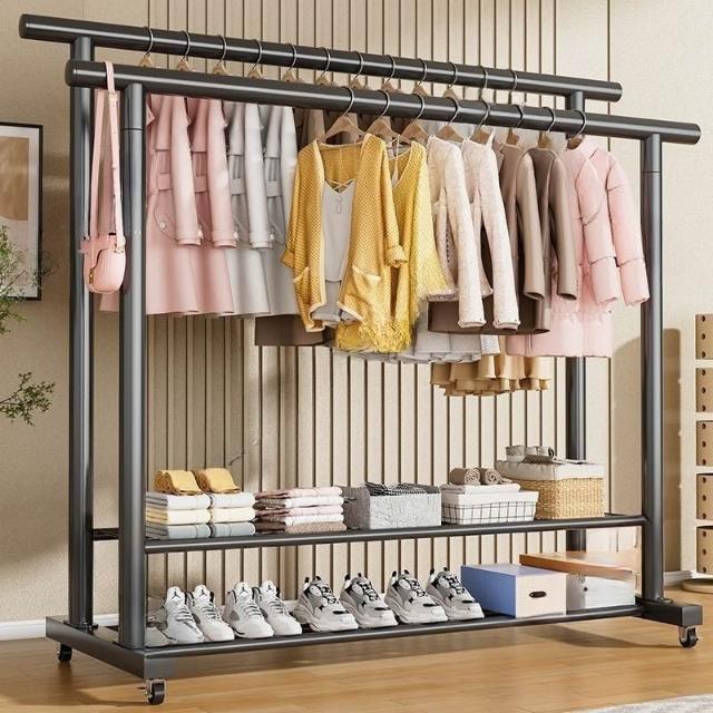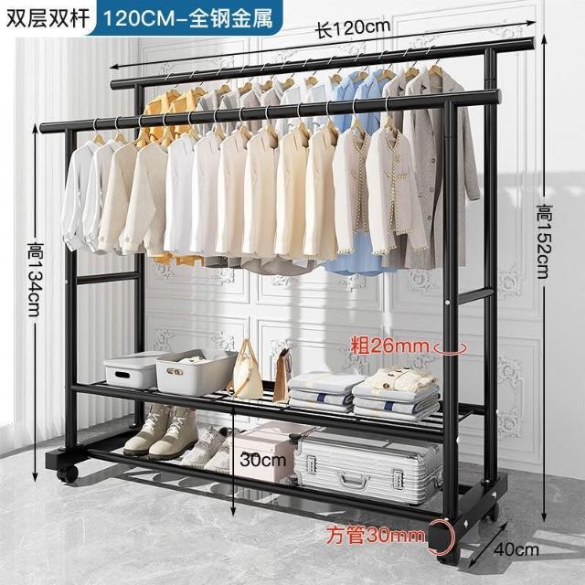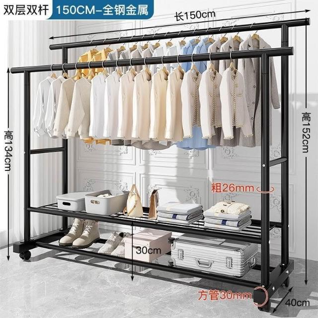雙層多功能晾衣架 特粗特厚落地立式掛衣架 雙排衣桿帶360°萬向輪 雙排掛杆 加密鏤空置物網 120/150cm