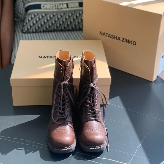 全真皮時尚百搭復古綁帶粗跟馬丁靴經典舒適流行女靴小牛皮女鞋子 黑色 棕色