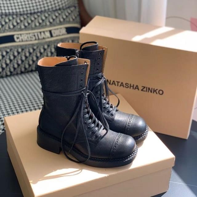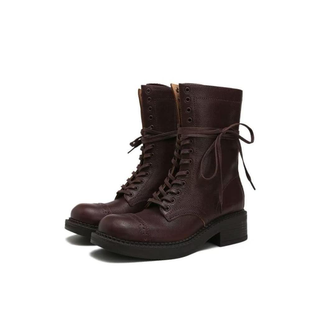 全真皮時尚百搭復古綁帶粗跟馬丁靴經典舒適流行女靴小牛皮女鞋子 黑色 棕色