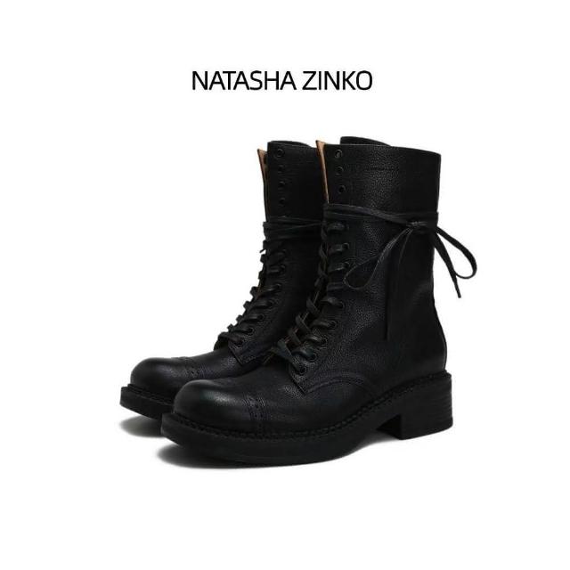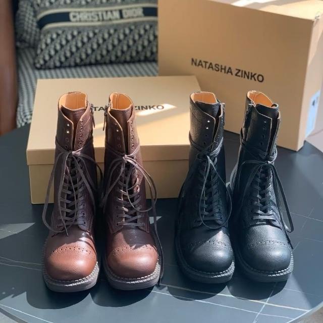 全真皮時尚百搭復古綁帶粗跟馬丁靴經典舒適流行女靴小牛皮女鞋子 黑色 棕色