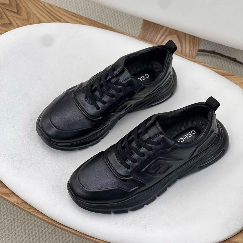 全真皮時尚舒適百搭男士綁帶鞋牛皮氣墊休閒鞋運動鞋 黑色