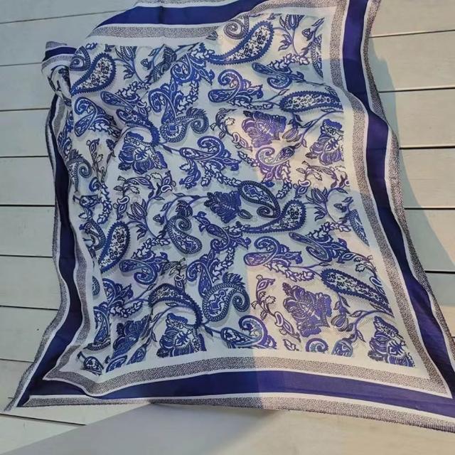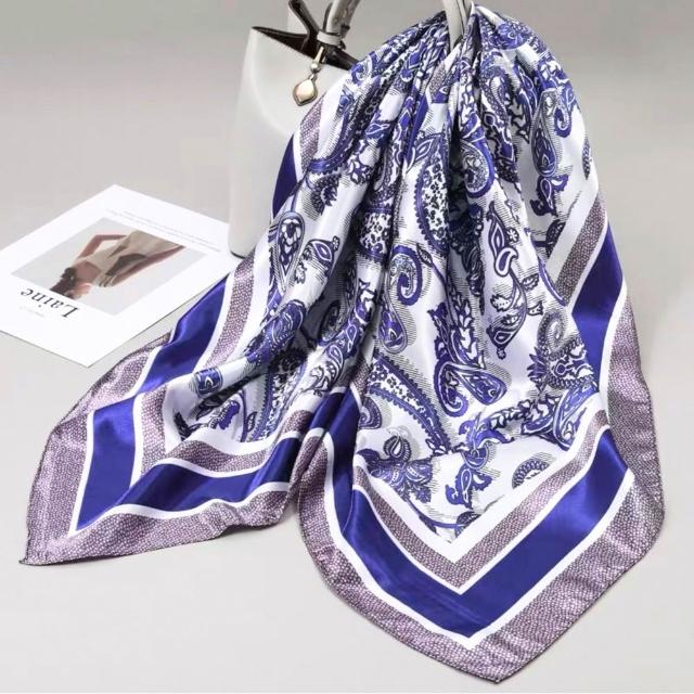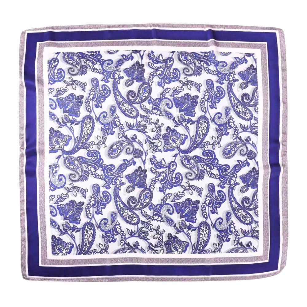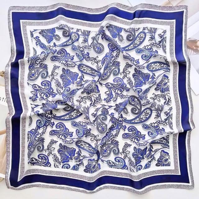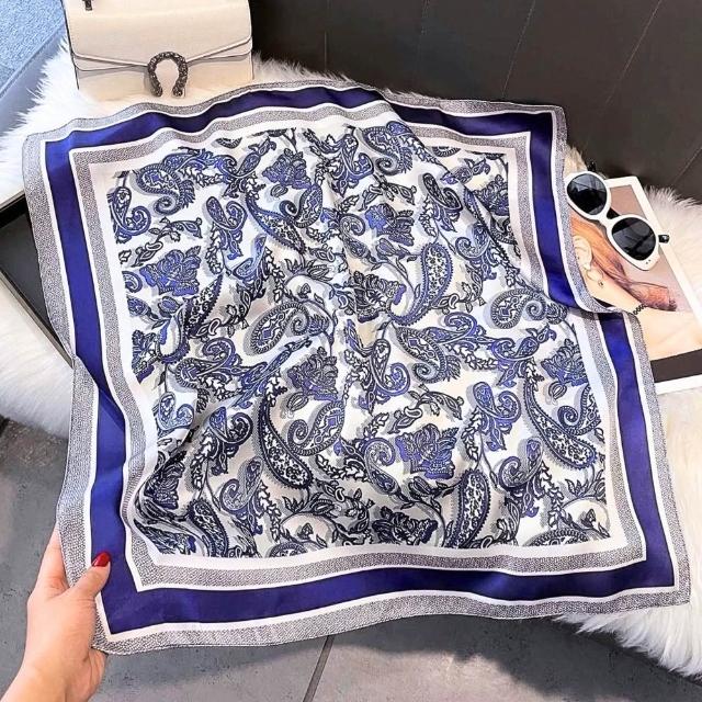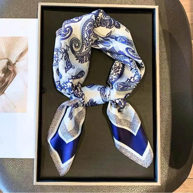 絲巾 方巾 仿真絲 小方巾 藍色 腰果花 70x70 小花 韓系 法式 復古 髮帶 領巾 綁包 腰帶 氣質 SA071
