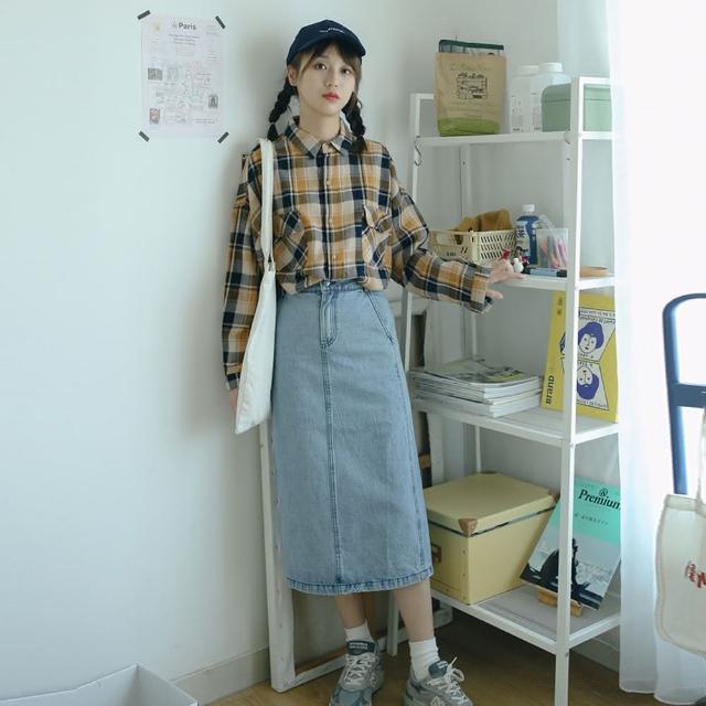 那木雙口袋棉料磨毛格子襯衫(寬鬆格紋男友風polo上衣)
