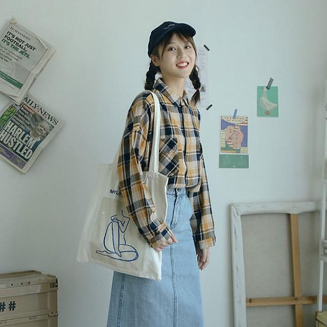 那木雙口袋棉料磨毛格子襯衫(寬鬆格紋男友風polo上衣)