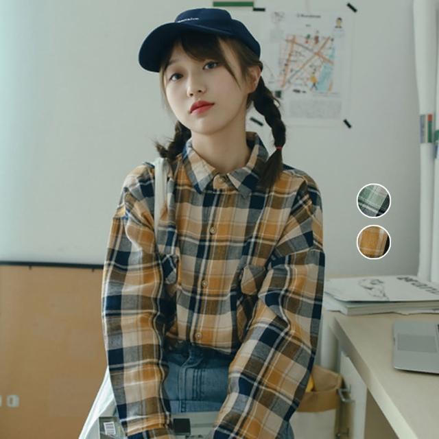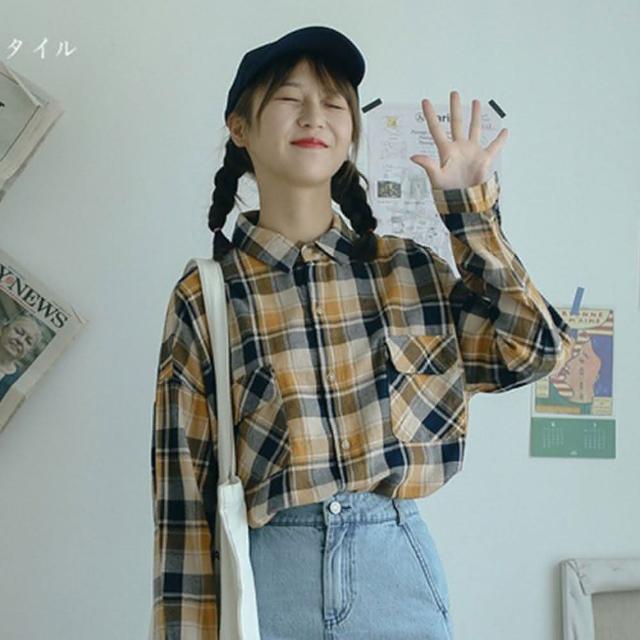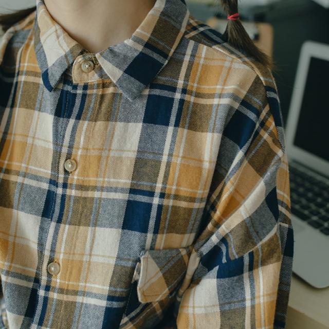 那木雙口袋棉料磨毛格子襯衫(寬鬆格紋男友風polo上衣)
