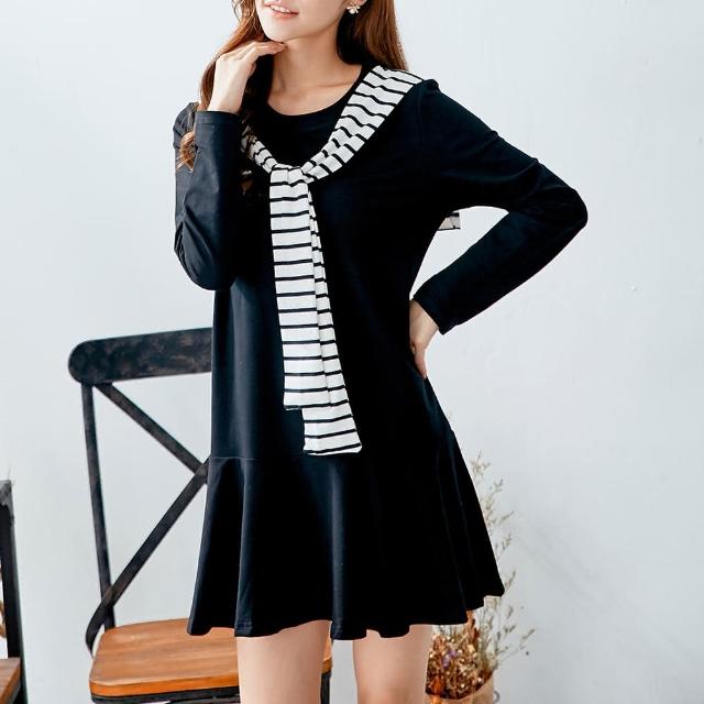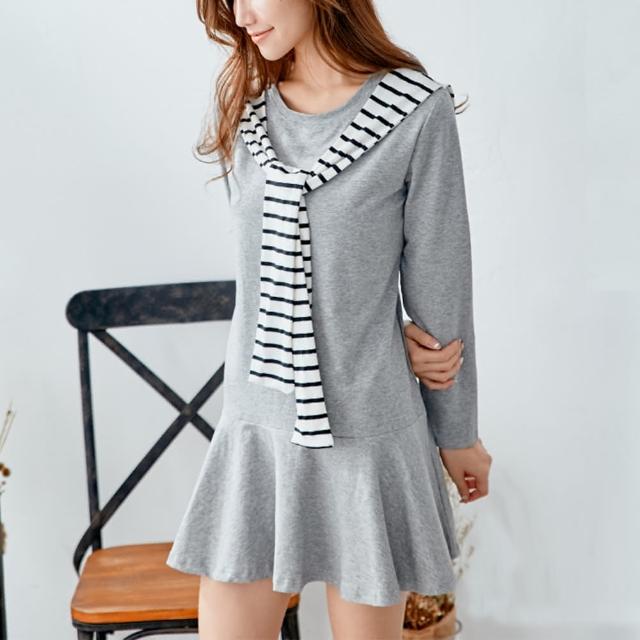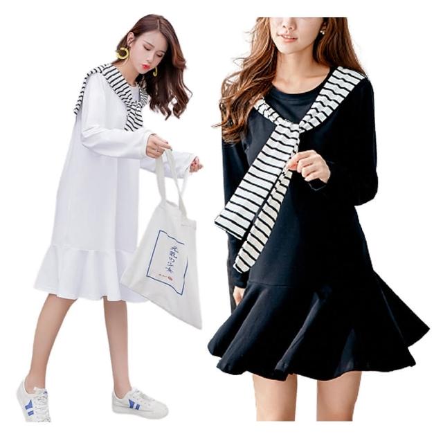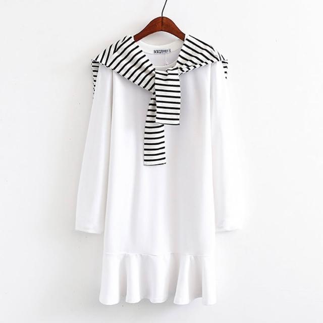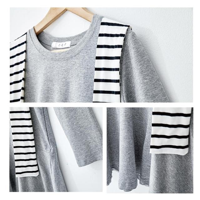 良池條紋浪擺長袖棉料長版上衣連身裙(現貨)
