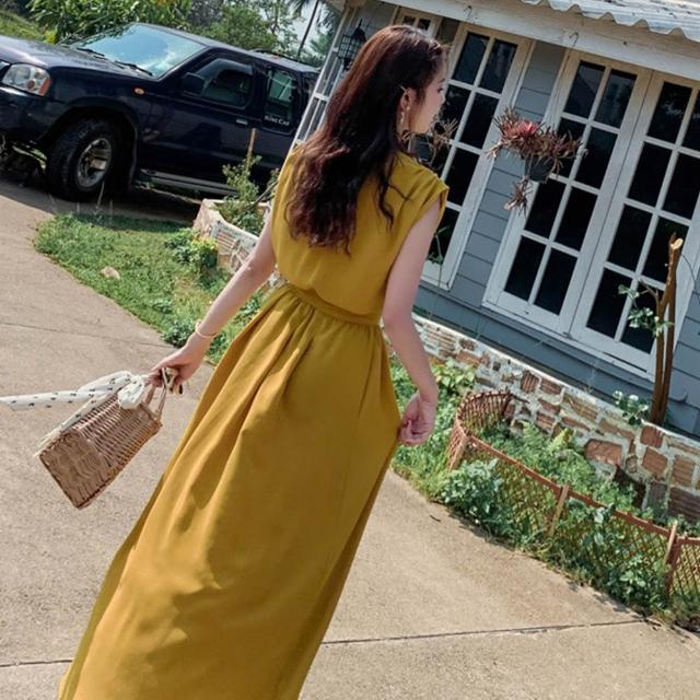 良池法式V領排扣連身裙洋裝(雪紡飛袖上衣大擺長裙連衣裙)