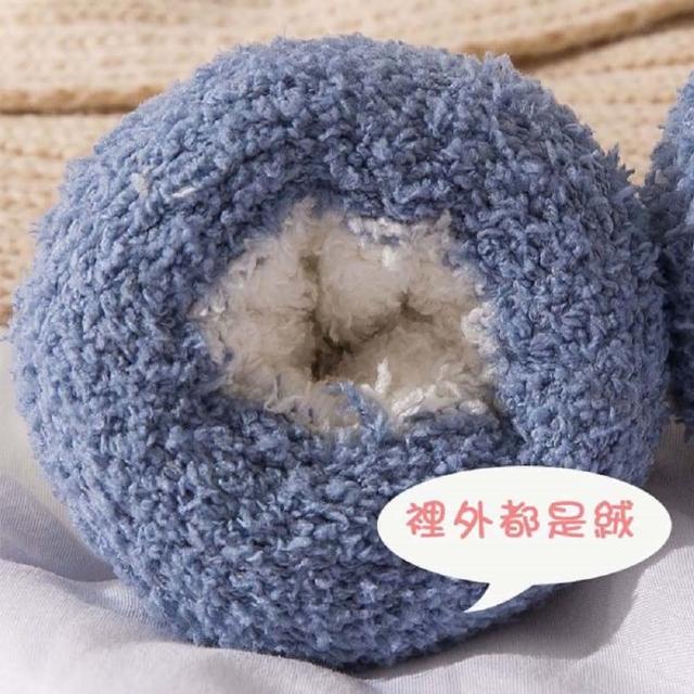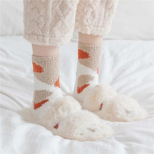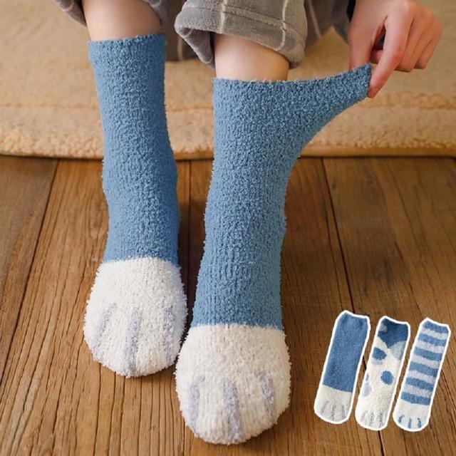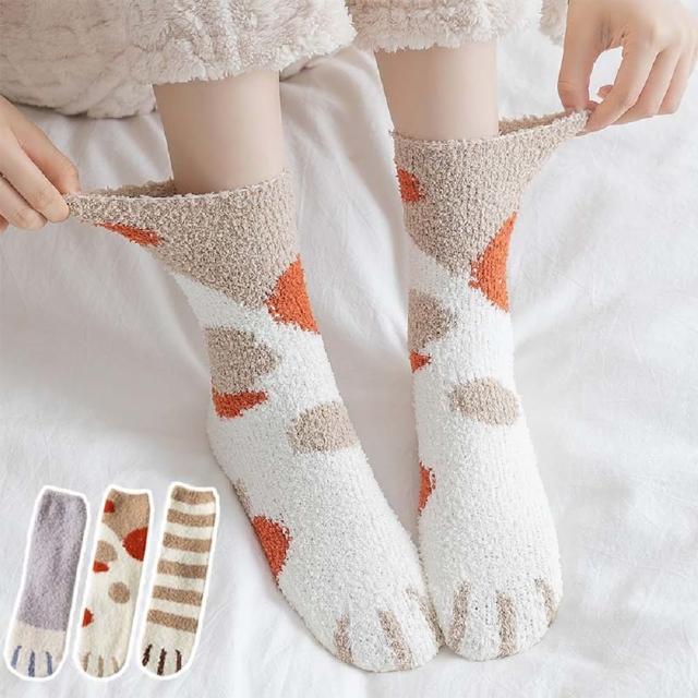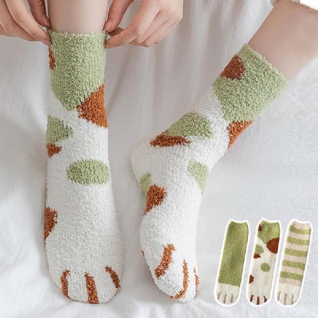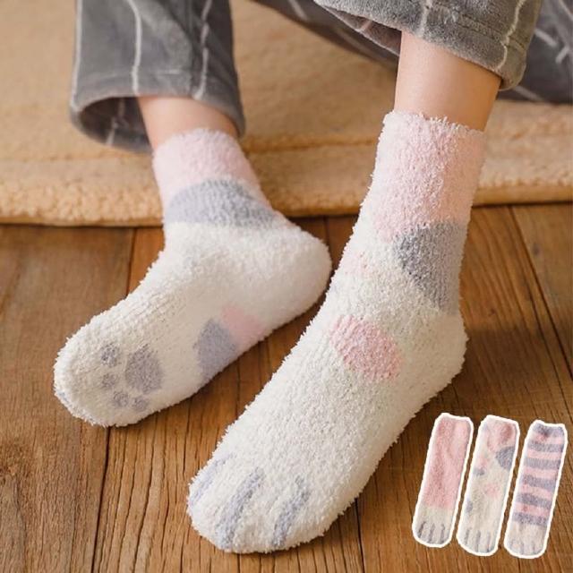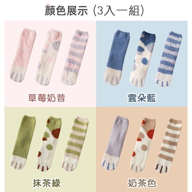 良池保暖糖果色珊瑚絨地板襪中筒襪睡眠貓爪襪(3入組)
