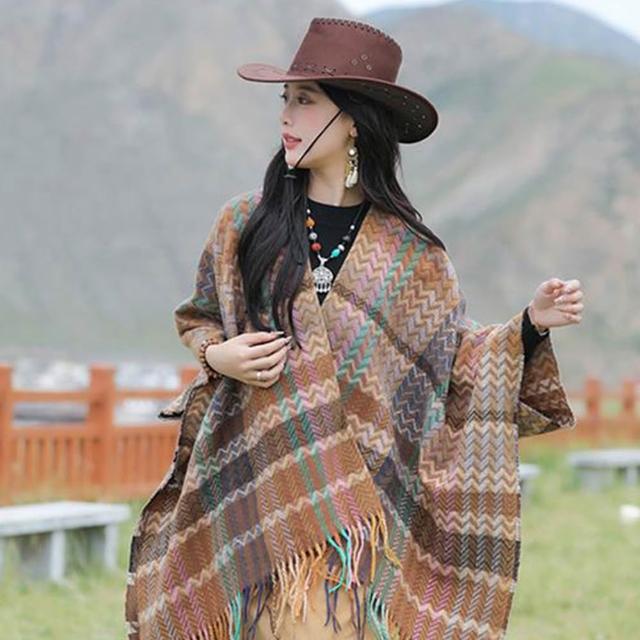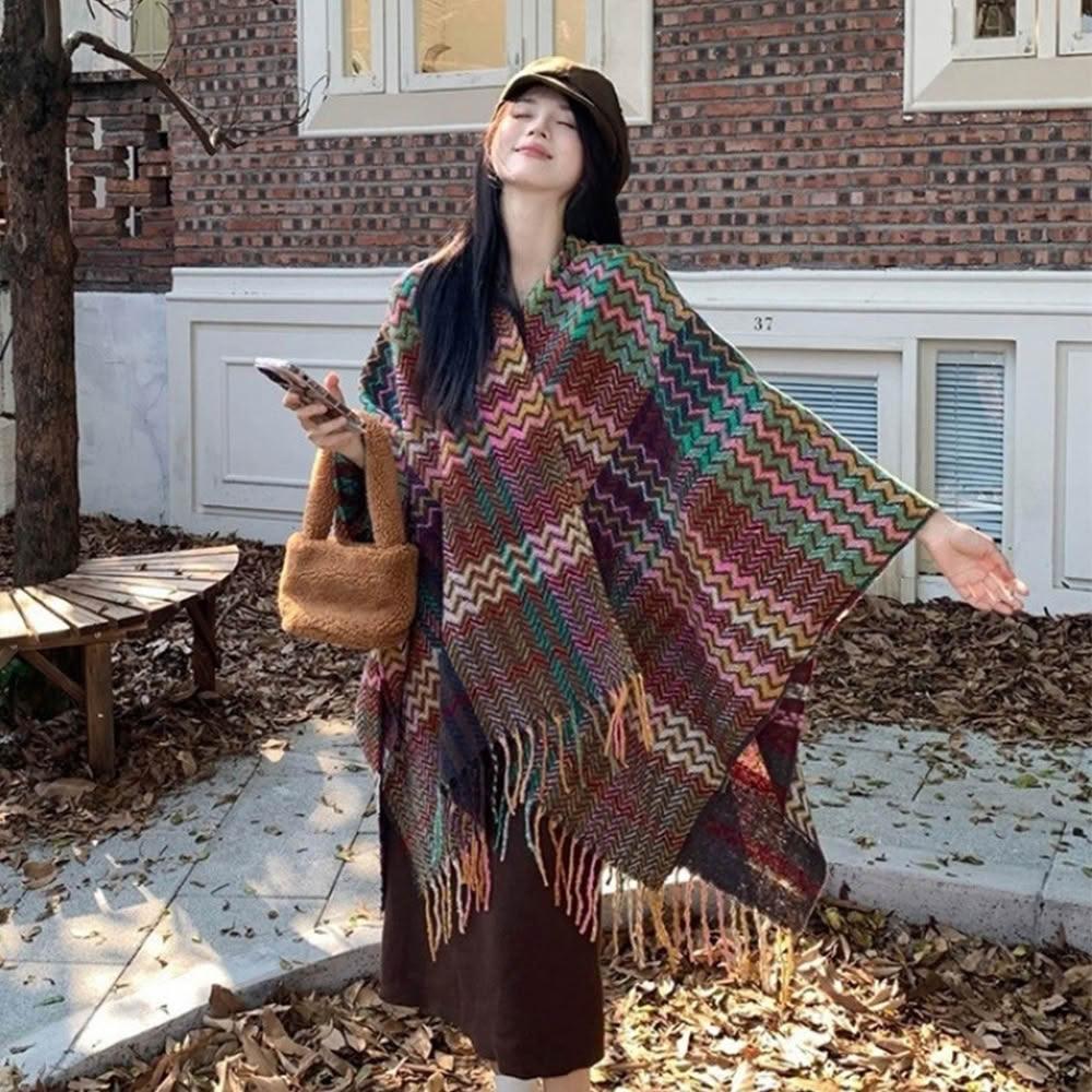 良池民族風披肩 復古流蘇外搭斗篷 格紋水波紋