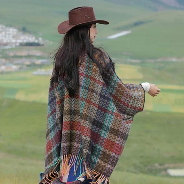 良池民族風披肩 復古流蘇外搭斗篷 格紋水波紋