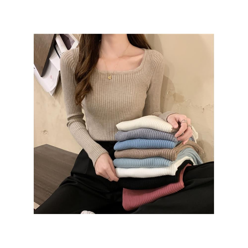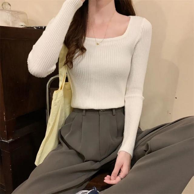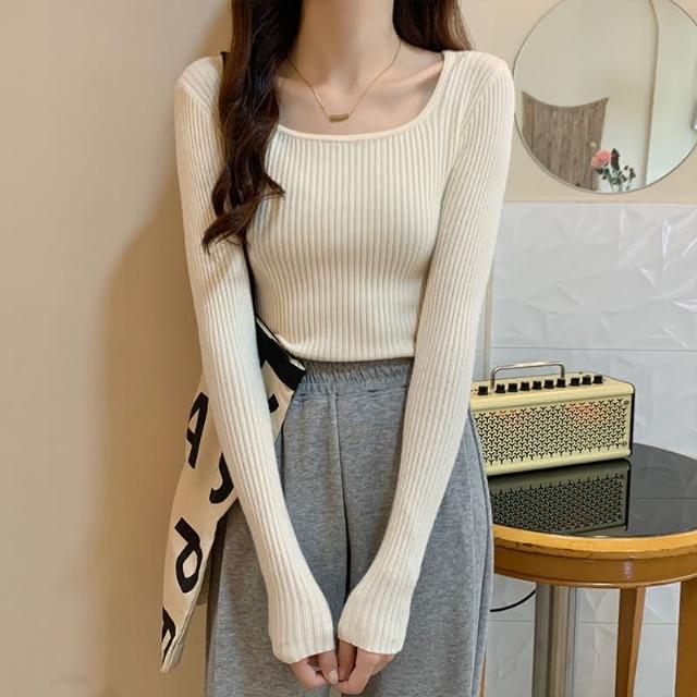 秋冬韓版坑條長袖針織上衣 方領針織毛衣女 針織上衣 內搭修身打底上衣 女裝 衣服 上衣 保暖 針織衫 毛衣 針織打底 長