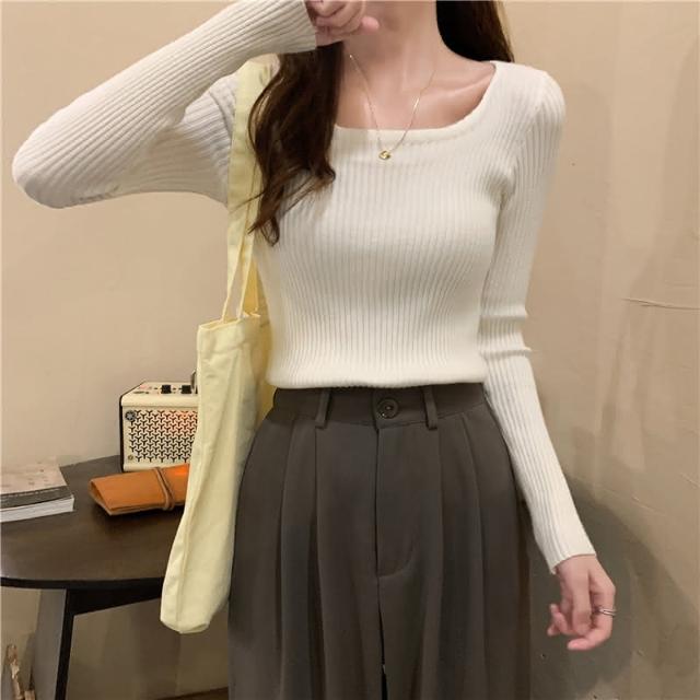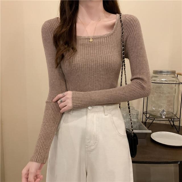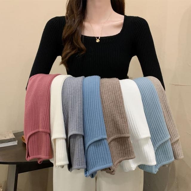秋冬韓版坑條長袖針織上衣 方領針織毛衣女 針織上衣 內搭修身打底上衣 女裝 衣服 上衣 保暖 針織衫 毛衣 針織打底 長