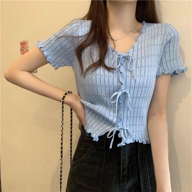 韓版修身V領坑條鈕扣綁帶針織上衣 木耳邊針織短袖 短版上衣 夏季 修身 v領針織衫 素T 短款 顯瘦上衣 短t 短袖上衣