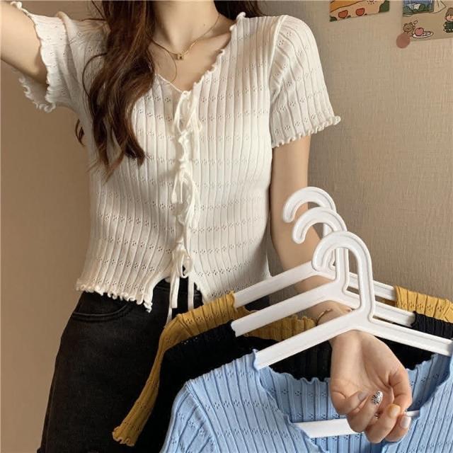 韓版修身V領坑條鈕扣綁帶針織上衣 木耳邊針織短袖 短版上衣 夏季 修身 v領針織衫 素T 短款 顯瘦上衣 短t 短袖上衣