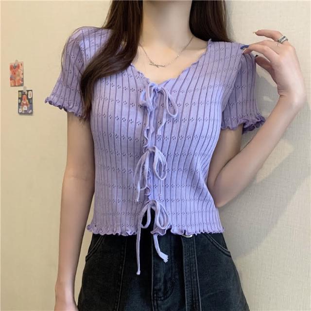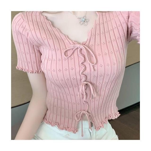 韓版修身V領坑條鈕扣綁帶針織上衣 木耳邊針織短袖 短版上衣 夏季 修身 v領針織衫 素T 短款 顯瘦上衣 短t 短袖上衣