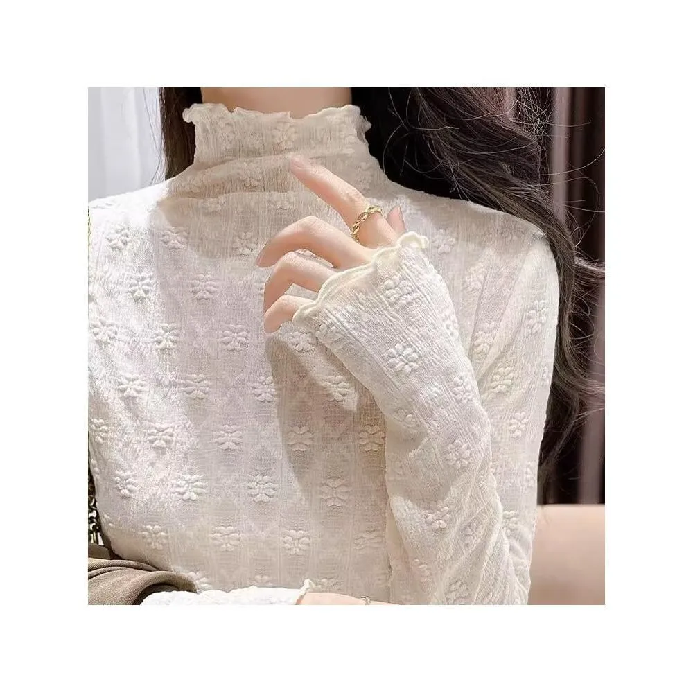 秋冬新款 半高領網紗打底衫 網紗長袖上衣 碎花打底衫 毛衣內搭紗衣 木耳邊 長袖 蕾絲上衣 上衣