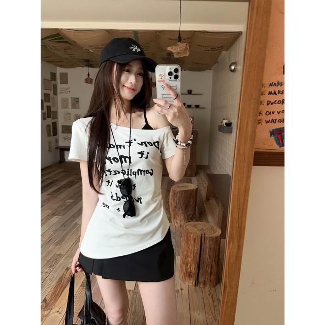 春夏新品 美式辣妹斜肩短袖T恤 字母印花 斜肩T恤 斜肩短袖 修身收腰露肩上衣 絕美斜肩上衣 T恤 短袖 短版上衣