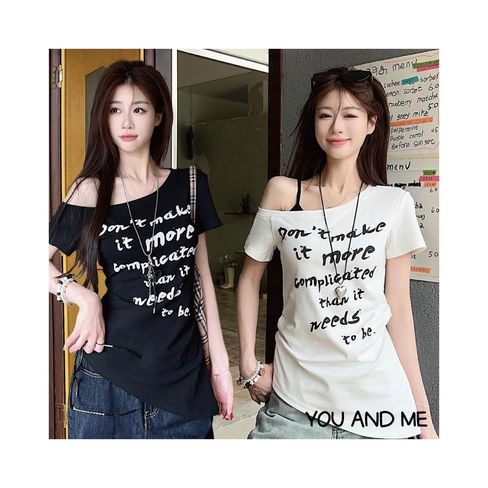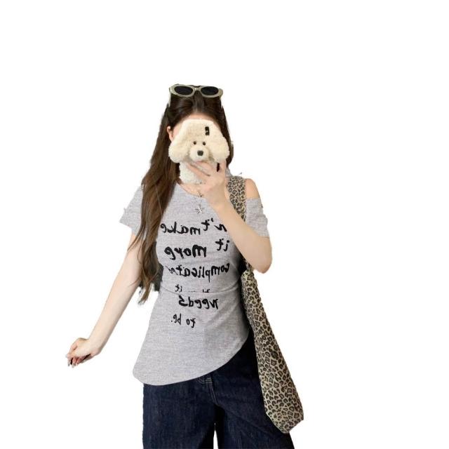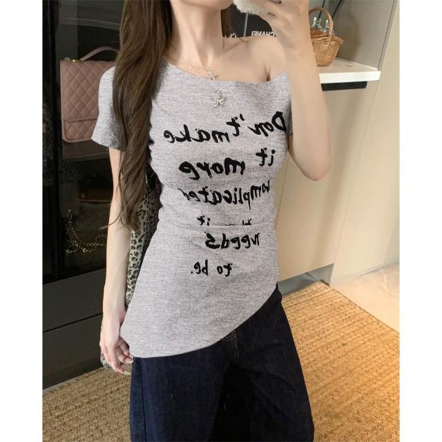 春夏新品 美式辣妹斜肩短袖T恤 字母印花 斜肩T恤 斜肩短袖 修身收腰露肩上衣 絕美斜肩上衣 T恤 短袖 短版上衣