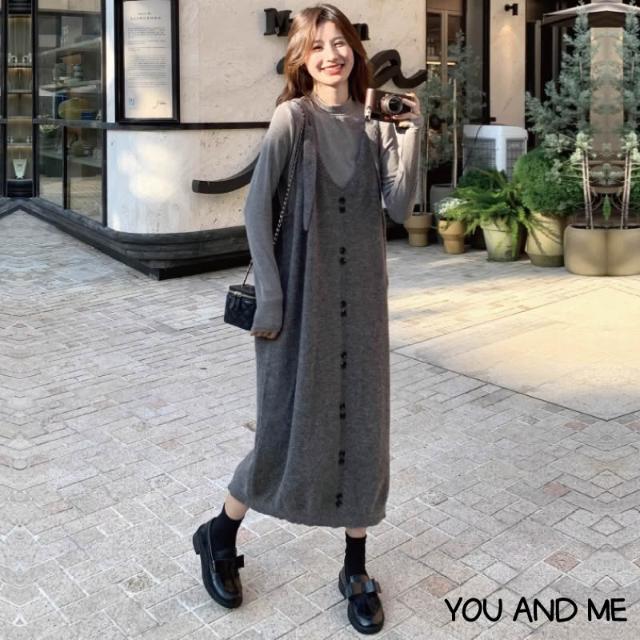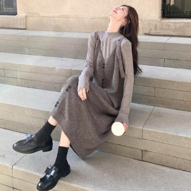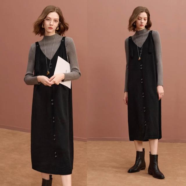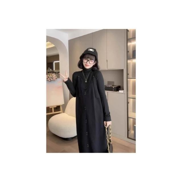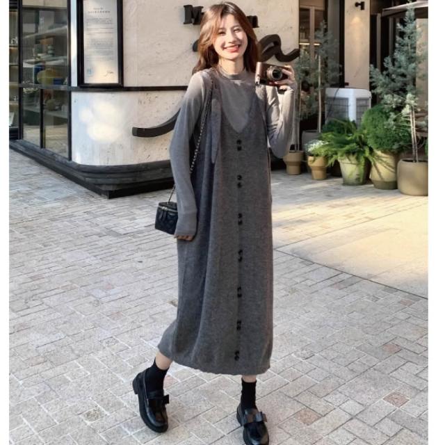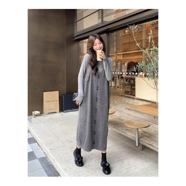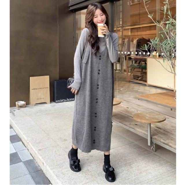 秋冬新品 針織背帶洋裝 寬鬆中長毛衣吊帶裙 孕婦裝 大尺碼 胖mm 寬鬆顯瘦吊帶裙 內搭打底高彈上衣 連身洋裝 裙子