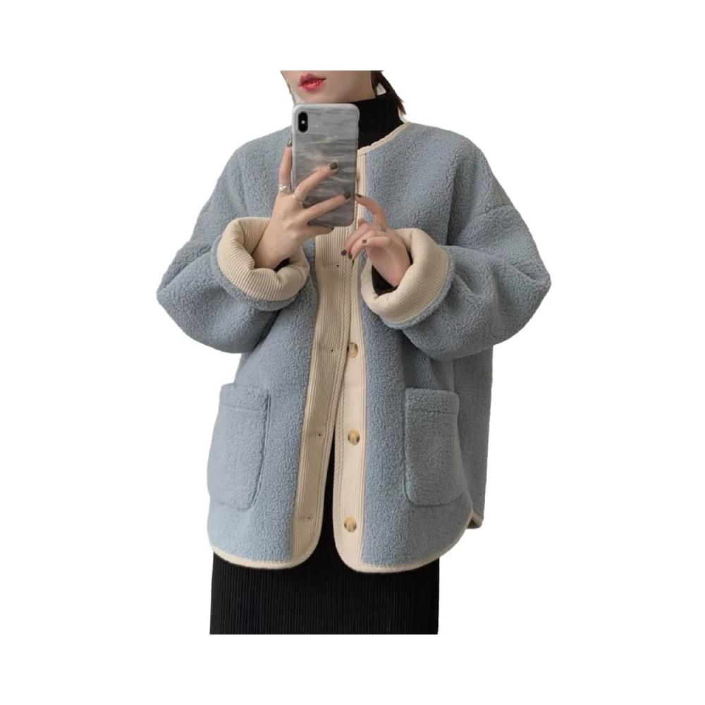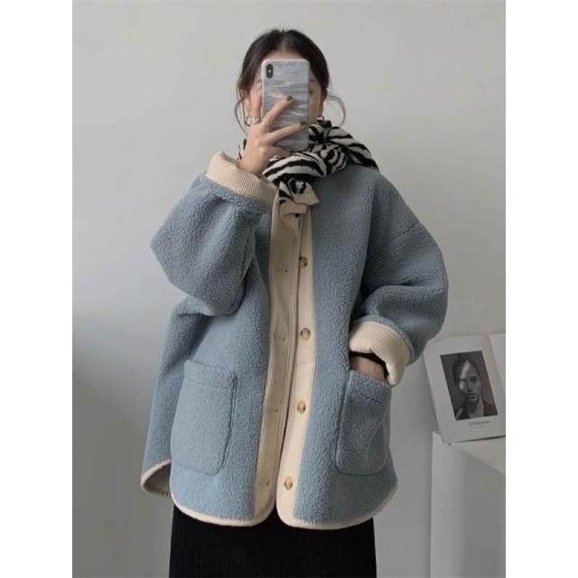 秋冬新品 仿羊羔毛外套 加厚羊羔毛外套 復古羊羔毛 寬鬆開襟衫 休閒撞色外套 拼接顆粒絨 大尺碼外套 仿羊羔毛 外套
