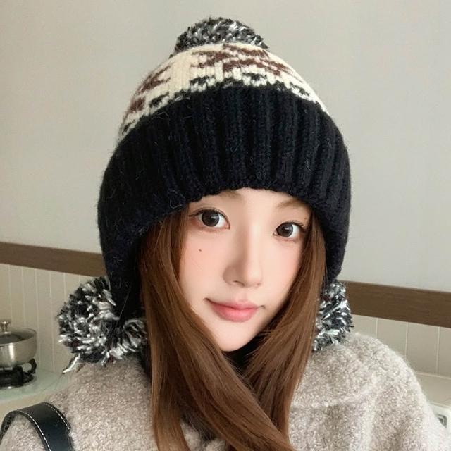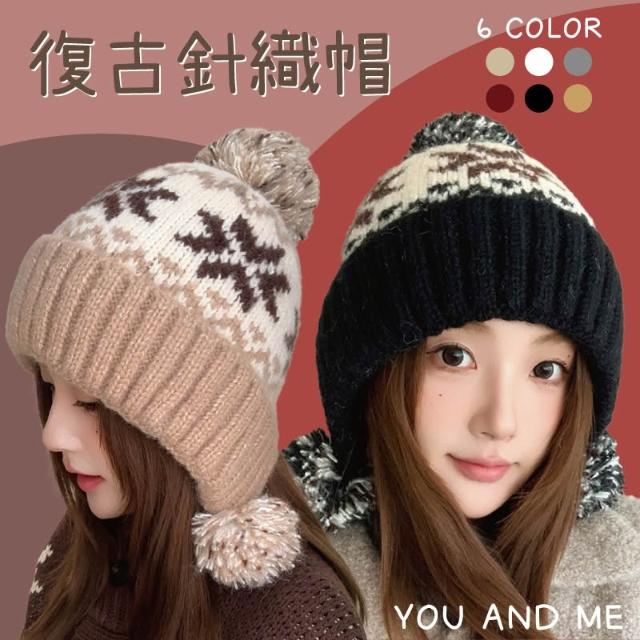 秋冬毛球提花針織帽 復古針織帽 護耳保暖毛帽 加絨針織 防寒保暖 顯臉小 造型帽 包頭帽 毛線帽 毛帽 帽子 針織帽