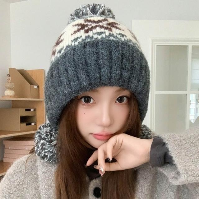 秋冬毛球提花針織帽 復古針織帽 護耳保暖毛帽 加絨針織 防寒保暖 顯臉小 造型帽 包頭帽 毛線帽 毛帽 帽子 針織帽