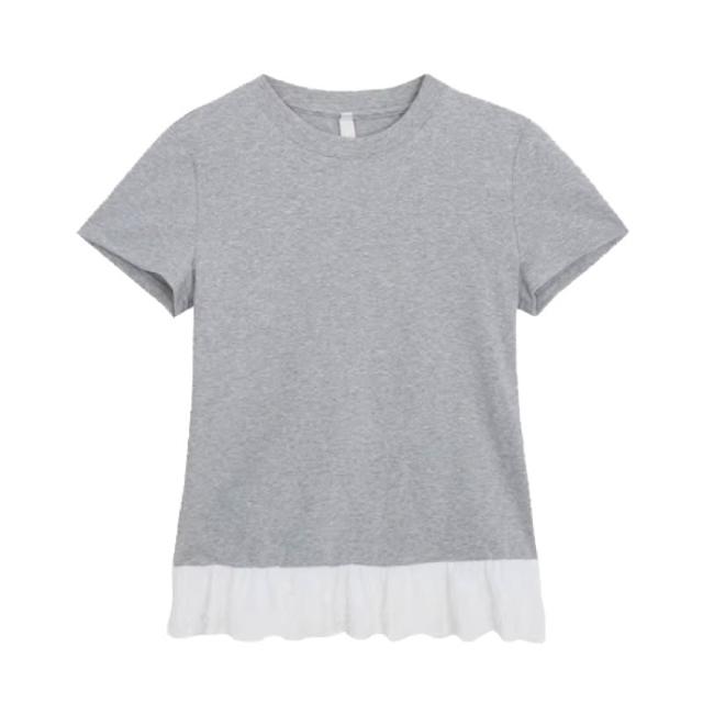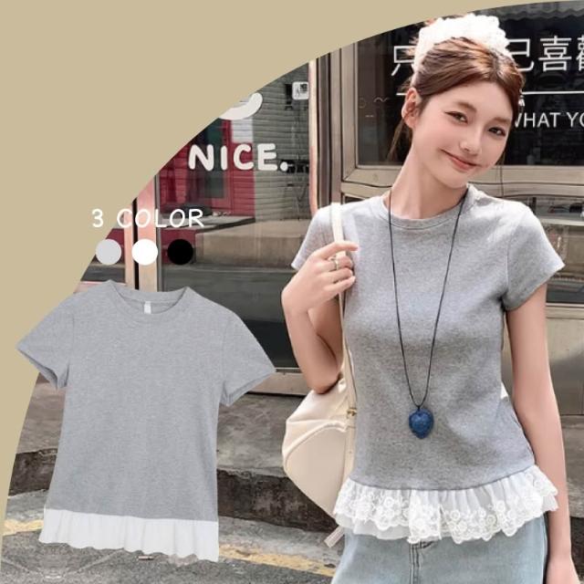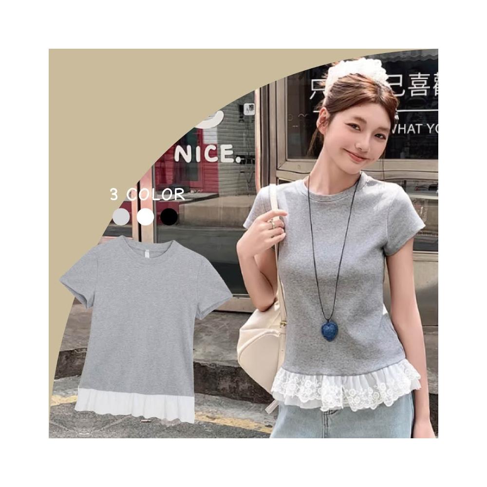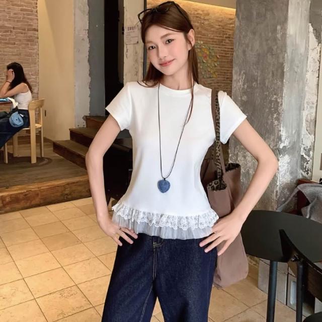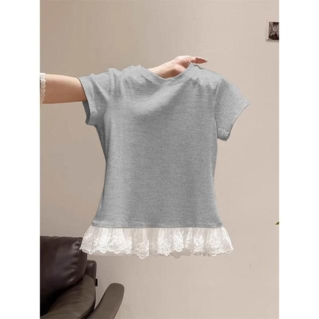 韓國荷葉邊蕾絲拼接短袖T恤 圓領修身顯瘦 芭蕾風上衣 百搭休閒短袖 甜美氣質內搭上衣 蕾絲花邊 圓領短袖T恤 休閒上衣