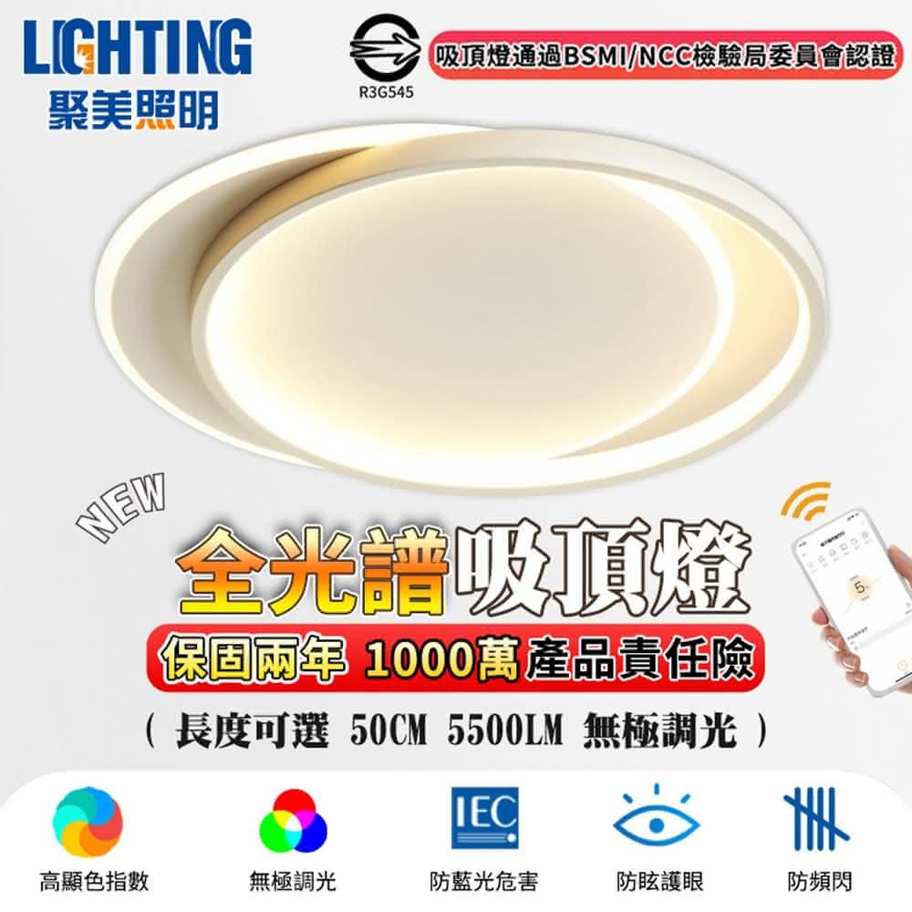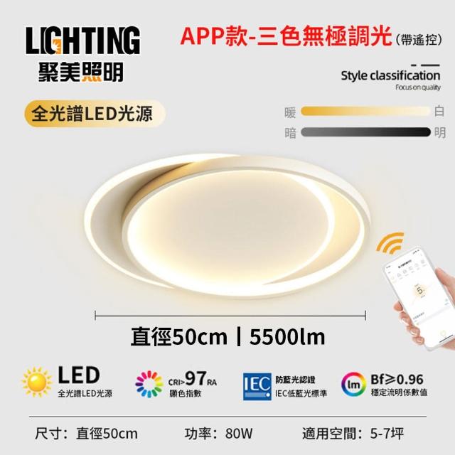 聚美照明簡約大氣led吸頂燈 智能APP無極三色調光 雙圈吸頂燈50cm(吸頂燈/客廳燈/臥室燈)