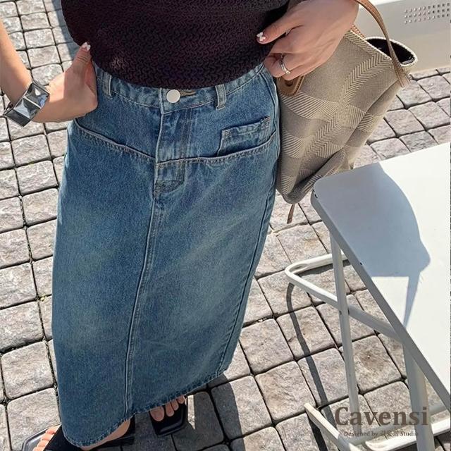 CavensiCavensi_S-5XL復古後開叉 高腰牛仔裙 梨形身材友善 遮臀中長裙 牛仔裙長裙 開岔裙 大尺碼 半身裙 A27