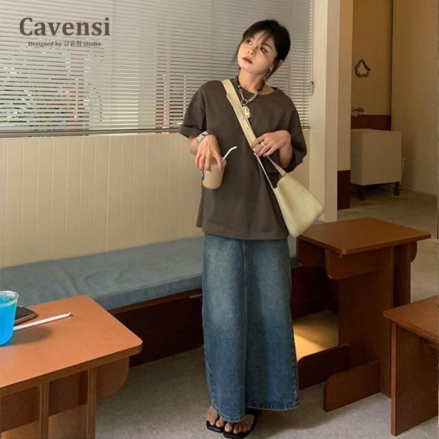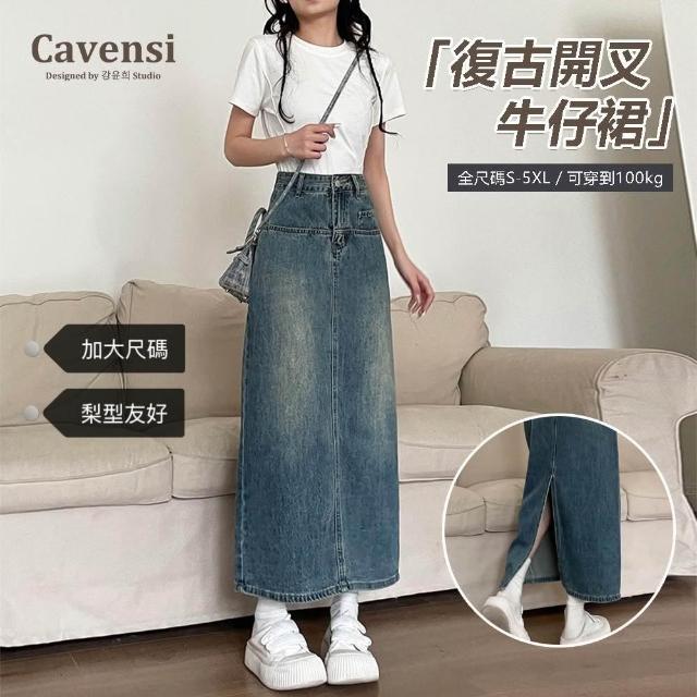 CavensiCavensi_S-5XL復古後開叉 高腰牛仔裙 梨形身材友善 遮臀中長裙 牛仔裙長裙 開岔裙 大尺碼 半身裙 A27