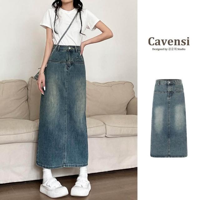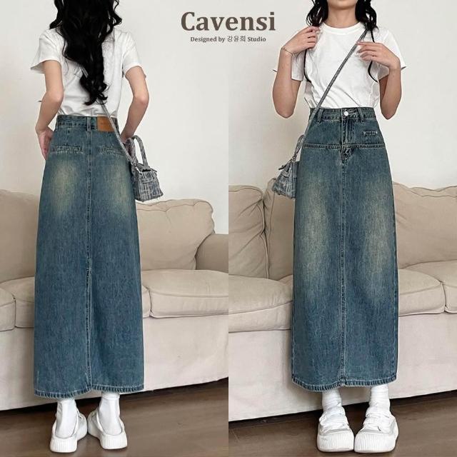 CavensiCavensi_S-5XL復古後開叉 高腰牛仔裙 梨形身材友善 遮臀中長裙 牛仔裙長裙 開岔裙 大尺碼 半身裙 A27