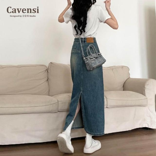 CavensiCavensi_S-5XL復古後開叉 高腰牛仔裙 梨形身材友善 遮臀中長裙 牛仔裙長裙 開岔裙 大尺碼 半身裙 A27