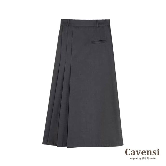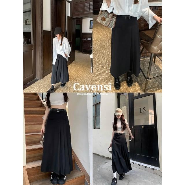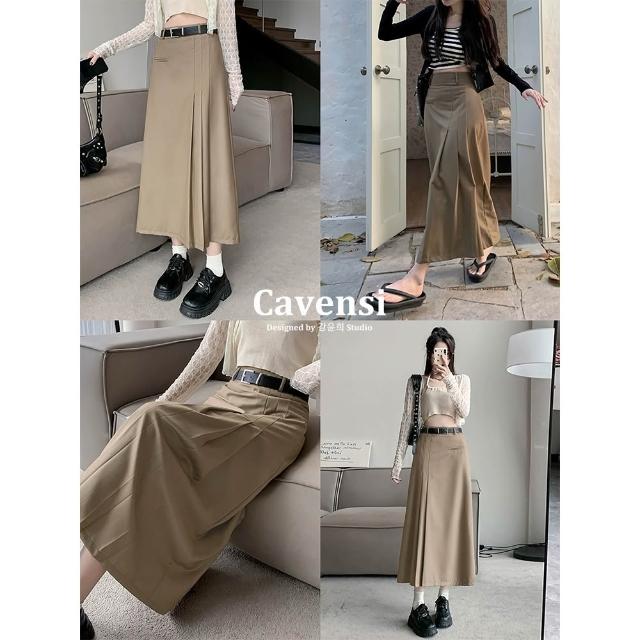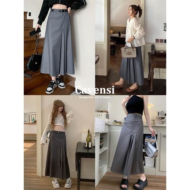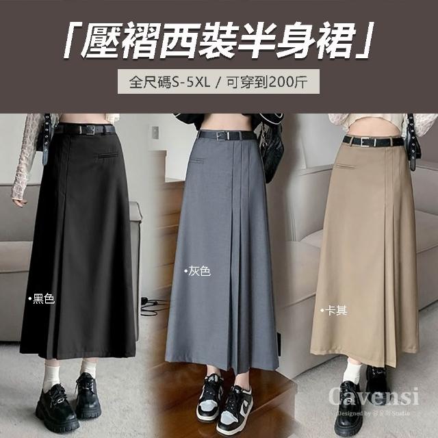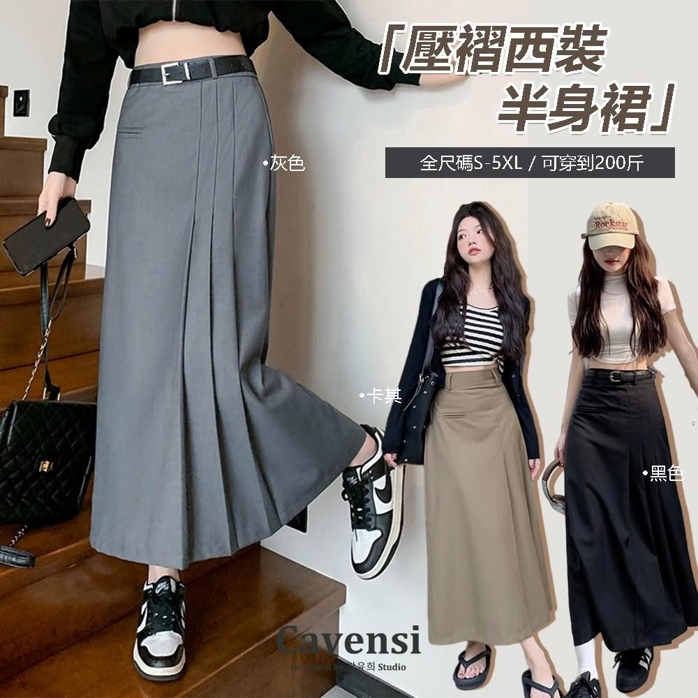 CavensiCavensi_大尺碼長裙 100公斤可穿 高腰壓褶西裝裙 a字長裙 長裙 大尺碼裙裝 黑/卡其/灰 大尺碼 裙 A1