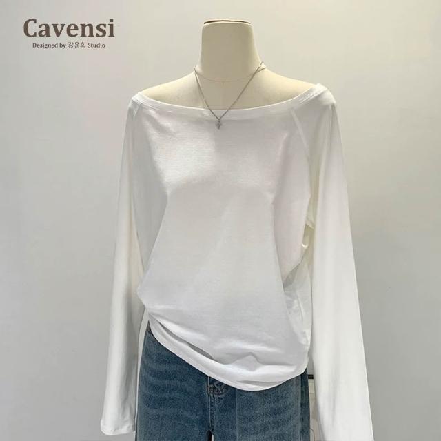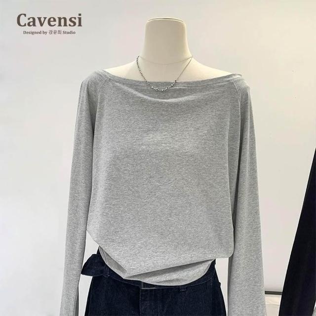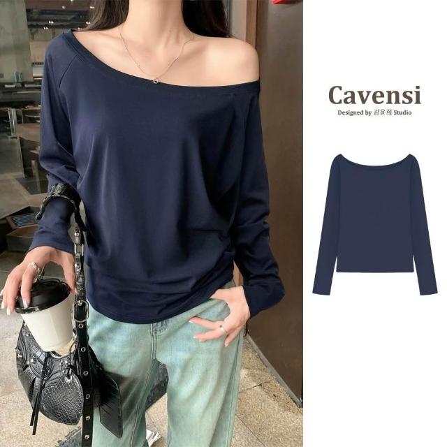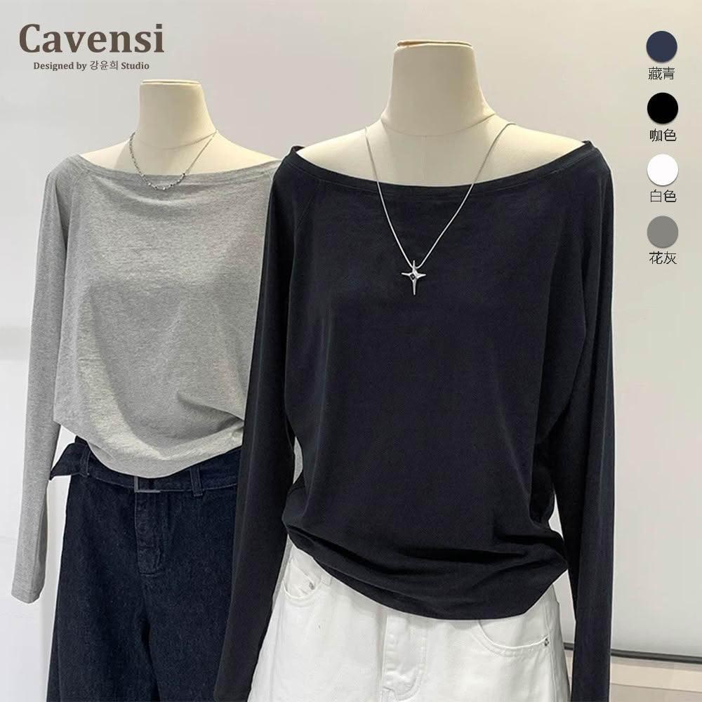 CavensiCavensi_M-3XL 斜肩長袖上衣4色 一字領 斜肩寬鬆 素色上衣 加大尺碼 一字領長袖上衣 露肩上衣 A213