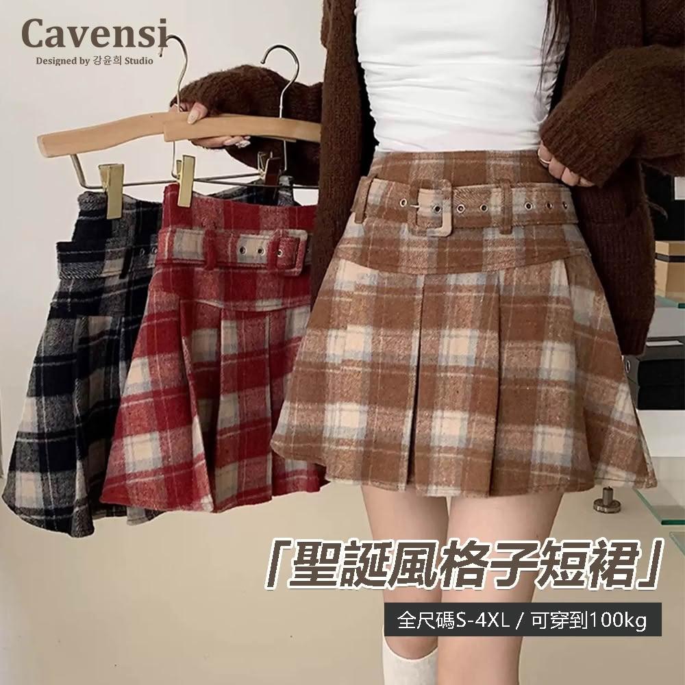 CavensiS-4XL🎅聖誕最出片 毛呢格紋百褶短裙(附腰帶) 格紋短裙 格子百褶裙 大尺碼短裙 聖誕穿搭 33T
