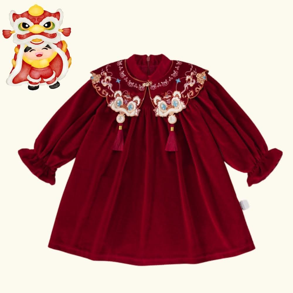 love charlotte 旗袍領祥龍刺繡領片紅色絲絨感洋裝(新年拜年服)