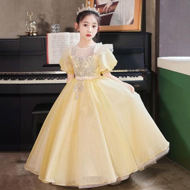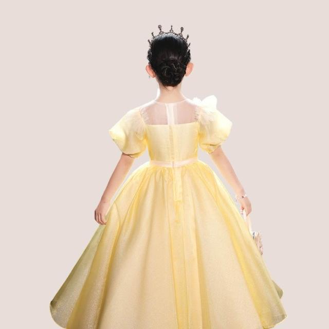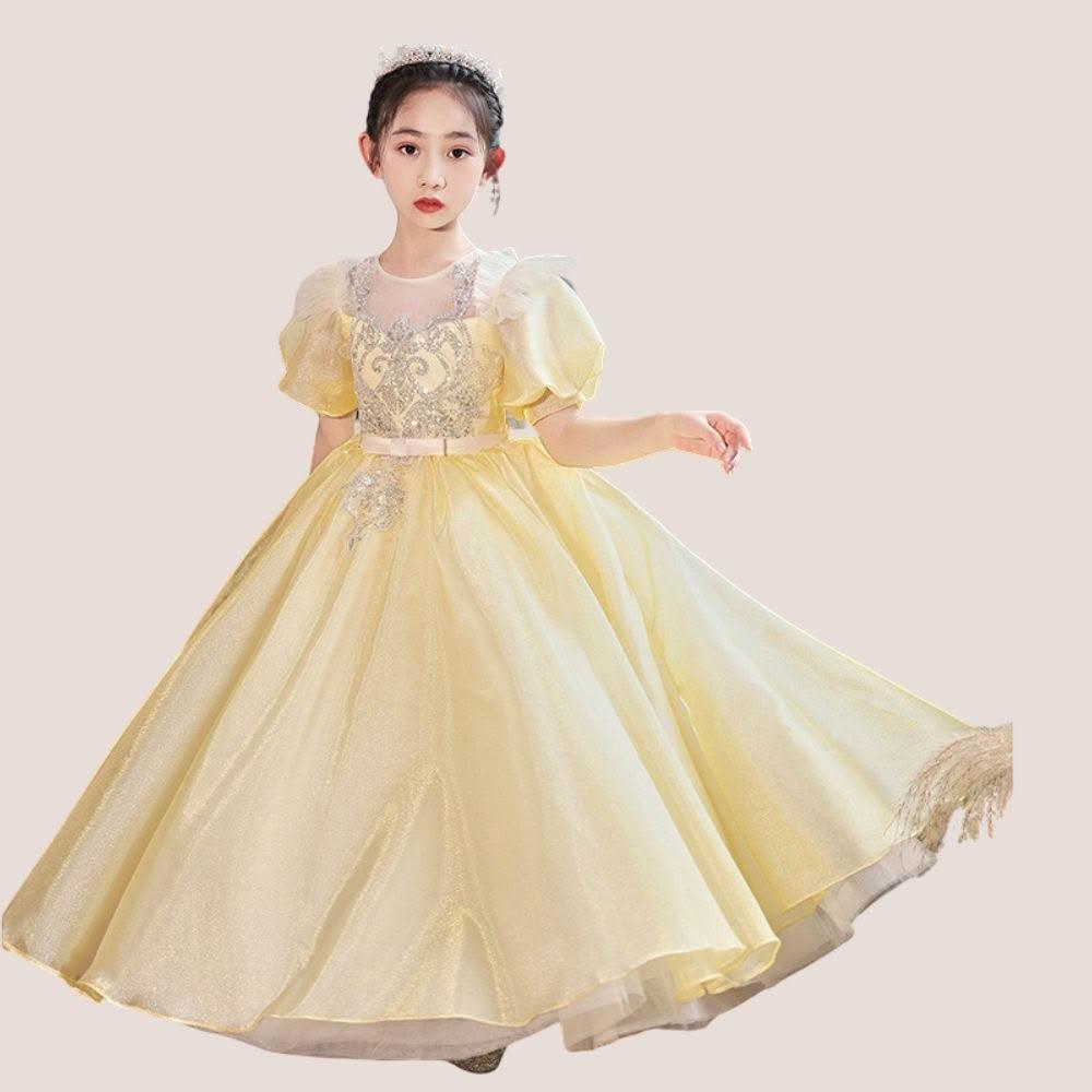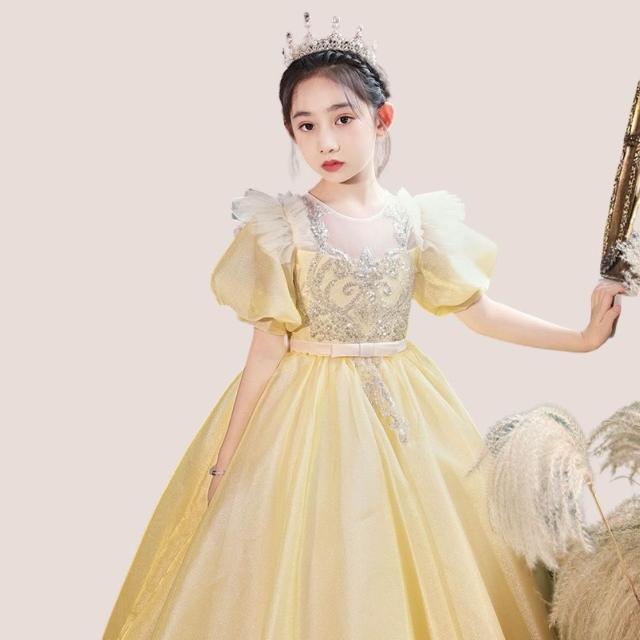 玫瑰故事柔美淺黃亮絲婚紗短袖長