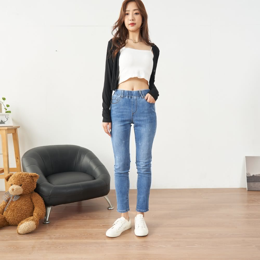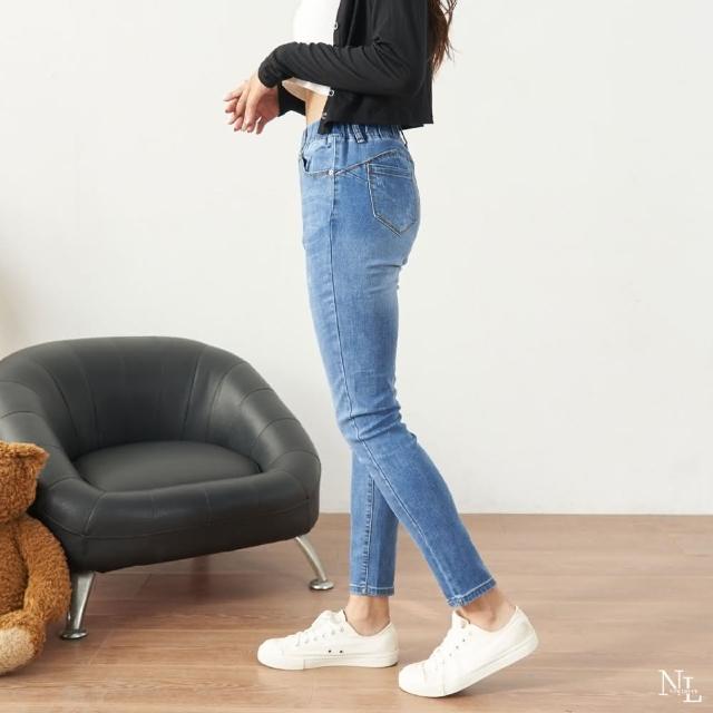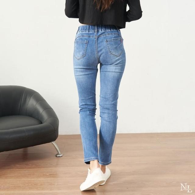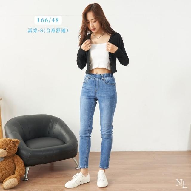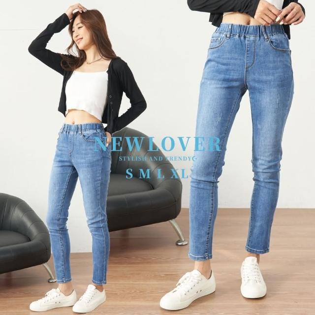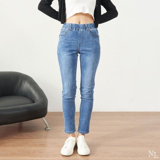 NEWLOVER牛仔時尚 高腰顯瘦 舒適感鬆緊腰刷痕窄管褲 S-2L 中大尺碼 牛仔褲 彈性長褲 161-6771