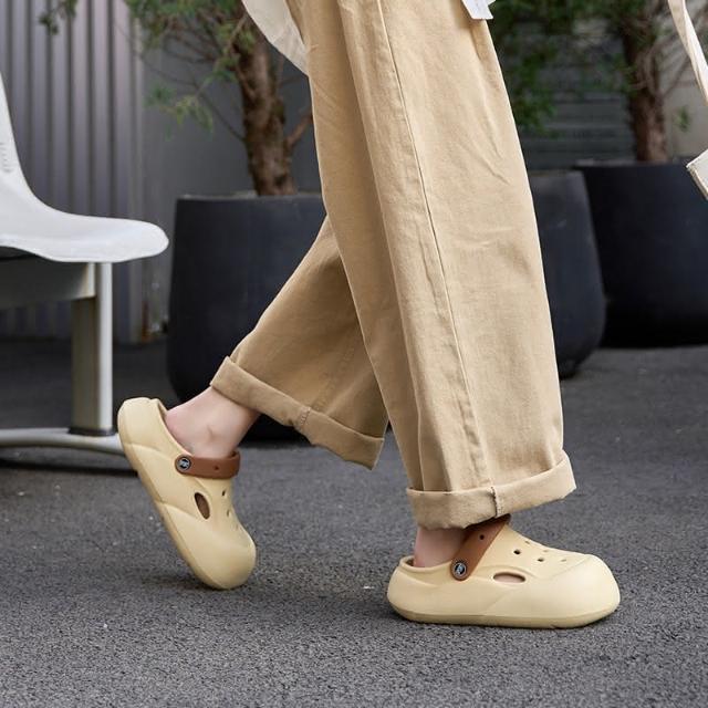 輕量化洞洞鞋 木扣爱心 青蛙 小蜜蜂(雙色洞洞鞋女透氣防滑踩屎感軟底涼鞋eva夏季外穿厚底包頭涼拖鞋)