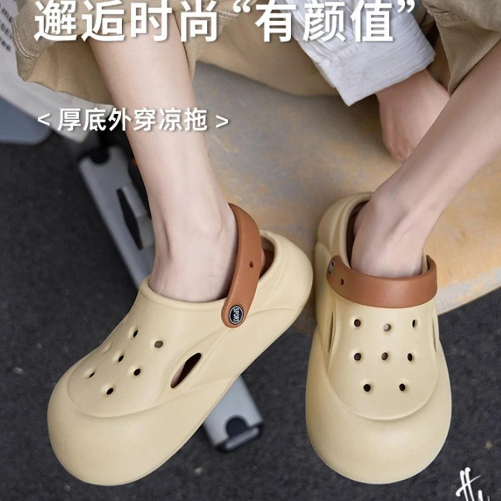 輕量化洞洞鞋 木扣爱心 青蛙 小蜜蜂(雙色洞洞鞋女透氣防滑踩屎感軟底涼鞋eva夏季外穿厚底包頭涼拖鞋)